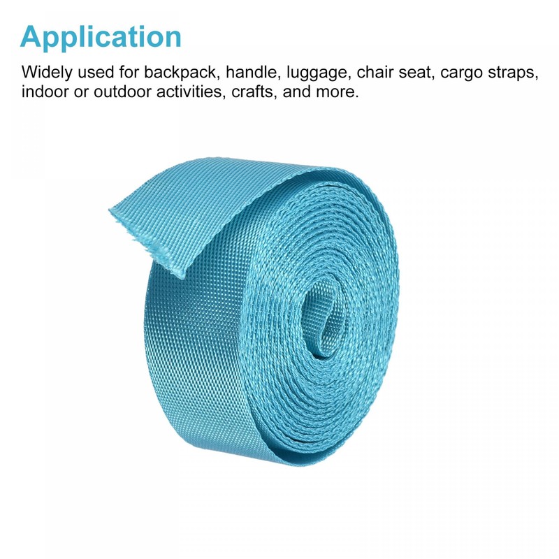 The flat nylon webbing strap, we provide here, is in size of: Length: 4 yards/12ft; Width: 25mm/1 inch; Thickness: 0.7mm/0.03 inch; Color: Lake Blue