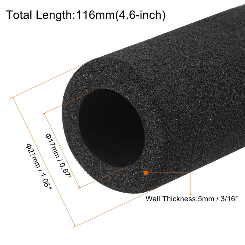 - Foam Grip Tubing, is in size of : 17mm(0.63-inch) inner dia, 27mm(1.02-inch) outer dia, 5mm(3/16-inch) wall thickness, 116mm(4.6-inch) total length