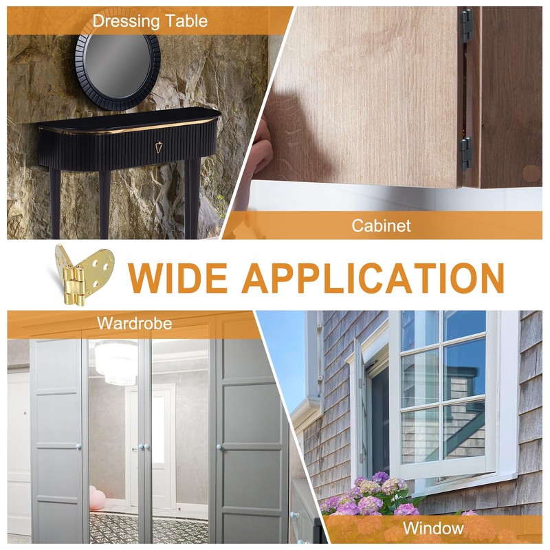 These flip hinges connect folding tables, sewing machine tables, computer desktops, dining tables, wardrobes, doors, windows, cabinets, drawers, and much more.