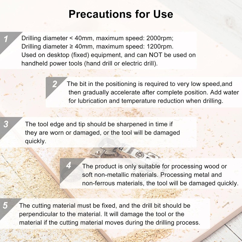 • Tips: Maximum speed: 2000rpm. Used on desktop (fixed) equipment, and can NOT be used on handheld power tools (such as hand drill or electric drill). Can not drill metal and non-ferrous metal. To avoid causing damage, be sure no nails or other metal objects in wood before drilling. The cutting edge and tip of the opener should be sharpened in time.