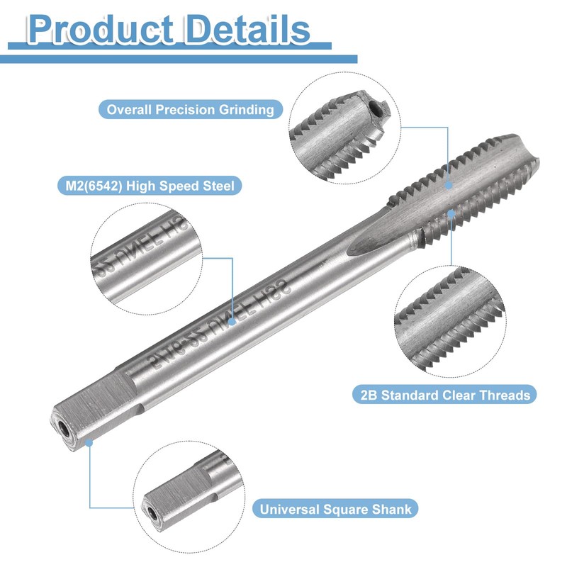 - Bottoming Style Tap: Bottom tap generates threads close to the bottom of a hole. The straight groove design of the hand tap can quickly remove chips downward, reduce operating resistance, and achieve efficient processing. The thread is clear and burr-free, which can achieve precise tapping.