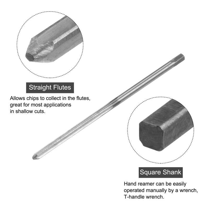 - Hand Reamer Size: Cutting diameter: 2mm / 0.08"; tolerance: H7; cutting flute length: 20mm / 0.79"; shank diameter: 1.7mm / 0.07"; overall length: 50mm / 1.97"; style: straight flutes, square shank