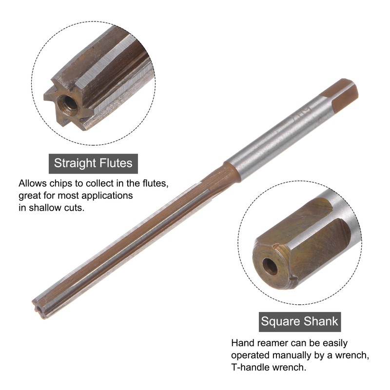 - Hand Reamer Size: Cutting diameter: 9mm / 0.35"; tolerance: H7; cutting flute length: 60mm / 2.36"; shank diameter: 7.5mm / 0.3"; overall length: 115mm / 4.53"; style: straight flutes, square shank