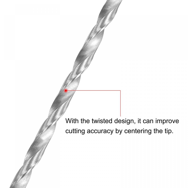 • [Twisted Design]- With the twisted design, it can improve cutting accuracy by centering the tip. It can avoid displacement of the drill bit during work, and at the same time remove debris and particles faster and easier.