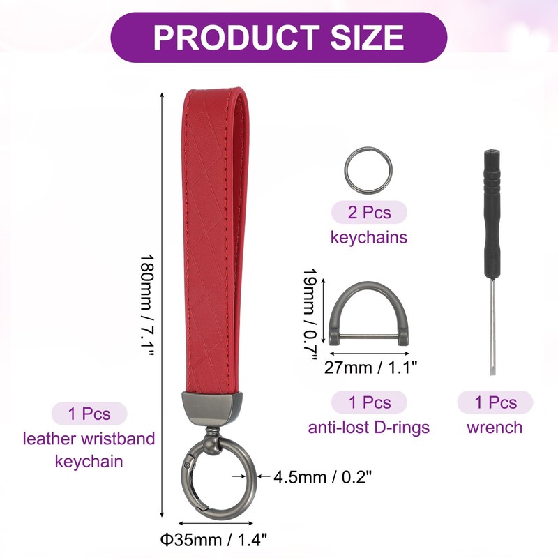 - The package contains 1Pcs leather wristband keychain, 2Pcs keychains, 1Pcs anti-lost D-rings and 1Pcs wrench. The length of the leather wristband is 180mm (7.1 inch), the outer diameter of the spring gate O rings is 35mm (1.4 inch), the wire diameter is 4.5mm (0.2 inch), and the size of the D-ring (L*W) is 27 x 19 mm (1.1x0.7 inch)