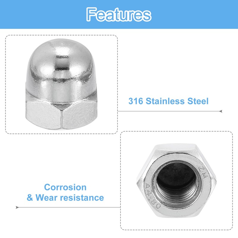 - Feature: Dome head hex nuts provide excellent protection for screws, bolts, and fasteners. Their design effectively shields against moisture, dust, and others, preventing rust and extending the lifespan of the hardware they secure.