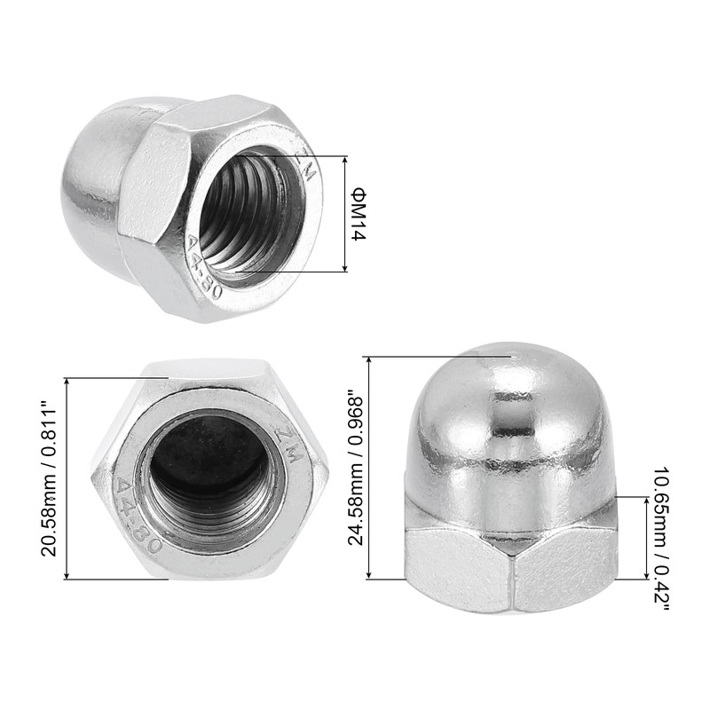- Specifications: Material: 316 Stainless Steel; Color: Silvery; Thread specification: M14; Hexagonal Diagonal Width: 20.58mm/0.811inch; Hex Height: 10.65mm/0.42inch; Total Height: 24.58mm/0.968inch; Package Content: 20Pcs x Acorn Cap Nuts