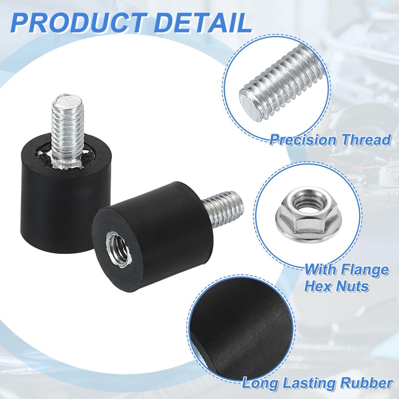 - Size&Package: Surface Treatment: Zinc Plated; Rubber Size: 8 x 8mm/0.31" x 0.31"(D*H); Male Thread Size: M3 x 6mm; Package: 4Pcs x Isolator Mount, 4Pcs x Serrated Flange Hex Nuts
