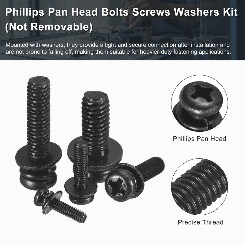 - [MATERIAL]: Phillips pan head machine screw combination is made of durable carbon steel, which has anti-rust and anti-corrosion properties. The material has good performance, high-temperature resistance, and durability, is not easy to deform, and is suitable for long-term indoor and outdoor use.