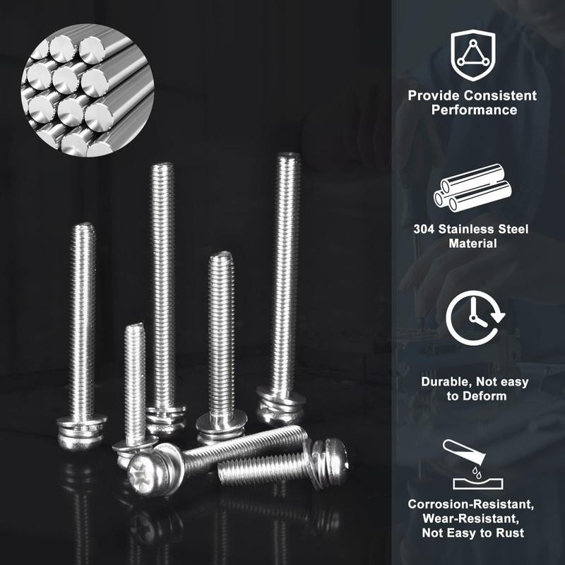 - [MATERIAL]: Phillips pan head machine screw combination is made of durable 304 stainless steel, which has anti-rust and anti-corrosion properties. The material has good performance, high-temperature resistance, and durability, is not easy to deform, and is suitable for long-term indoor and outdoor use