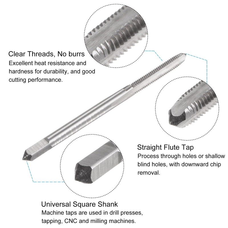 - Easy to Use: Machine taps are used in drill presses, tapping, CNC and milling machines. Use with appropriate lubricant (such as cutting fluid or oil) to get higher quality threads and more durable tap & drill bit. Not recommended for hand use and electric drill tapping.