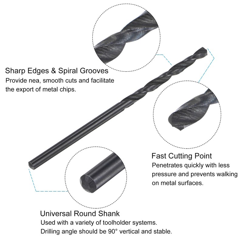 - Features: Black oxide coating on drill bits improves durability, corrosion resistance and lubricity, and helps reduce friction and heat, extending tool life. Twist drill bit has sharp cutting edges and large spiral grooves, which provide neat and smooth cuts and facilitate the export of metal chips.