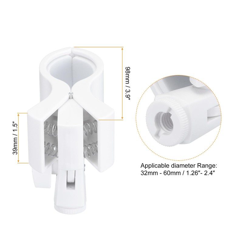 • Product name: Microphone Holders; Interface: Plastic Interface; Color: White; Total size: (LxWxH)98mm x 39mm x 86mm / 3.9 Inch x 1.5 Inch x 3.4 Inch; Mounting hole diameter: 5/8 Inch; Holder I.D: 32mm - 60mm / 1.26 Inch - 2.4 Inch; Applicable diameter Range: 32mm - 60mm / 1.26 Inch - 2.4 Inch; Accessories: 3/8 Plastic Adapter. In the package of: 2 Pcs x Microphone Holders with 3/8 Plastic Adapter;