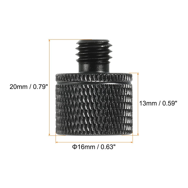 - Camera screw threads we offer here are in the size of: material: aluminium alloy; colour: black; body height: 13 mm / 0.59 inches; thread: 1/4 female to M8 male; thread spacing: 20G x 1.25 mm (socket x male), total size: 16 mm x 20 mm / 0.63 x 0.79 inches (D x H)