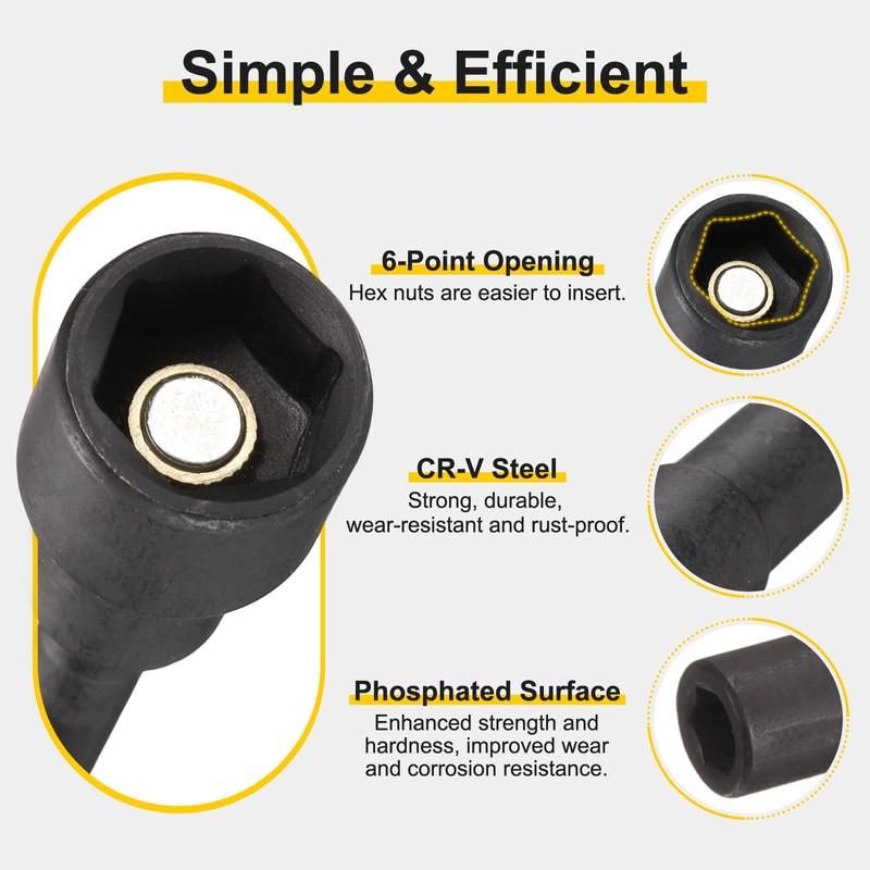 - Material - The nut driver drill bit tool is crafted to engage effectively with hexagonal socket screws and bolts. The tool is made of chrome vanadium alloy steel, ensuring robustness, longevity, abrasion resistance, and rust resistance, and the phosphating surface enhances high strength and hardness, improves wear resistance and corrosion resistance.