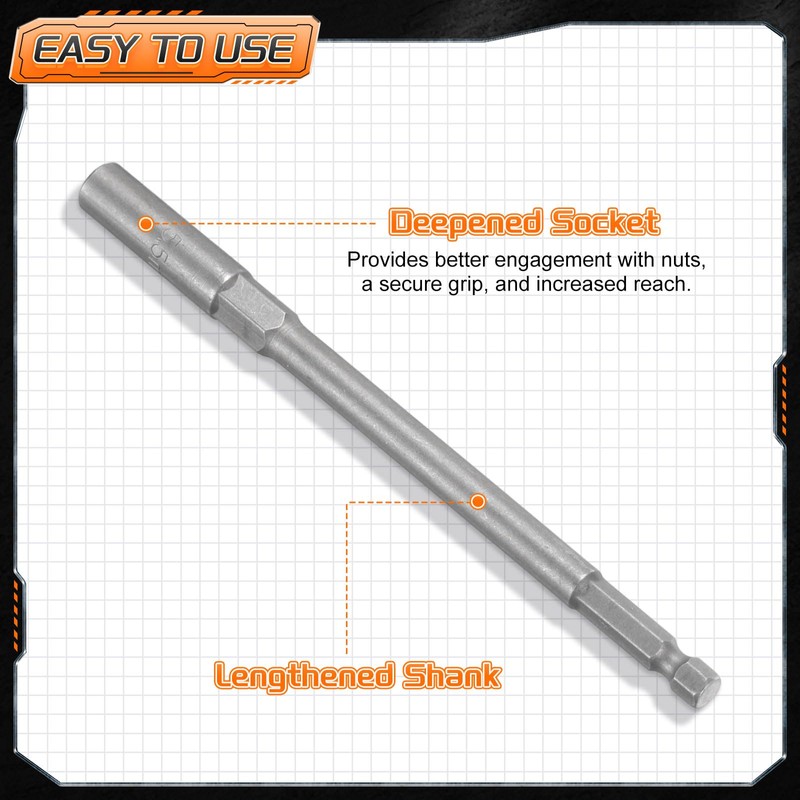 • Features - The deepened sleeve enhances gripping force, stability, torque resistance, and wear resistance. Hexagonal design helps achieve a solid grip and effective torque transfer from the tool to the fastener, reducing the effort needed. Additionally, the extended length design of this nut driver drill bit tool provides enhanced reach and access in tight spaces, ensuring it can effectively handle a wide range of applications with precision and ease.