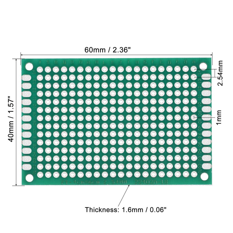 - The prototyping boards we provide here are in the size of: Dimension: 40mm x 60mm / 1.57 x 2.36 inch (W*L); Thickness: 1.6mm / 0.06 inch; Tinned Hole Diameter: 1mm / 0.04 inch; Tinned Hole Pitch: 2.54mm / 0.1 inch