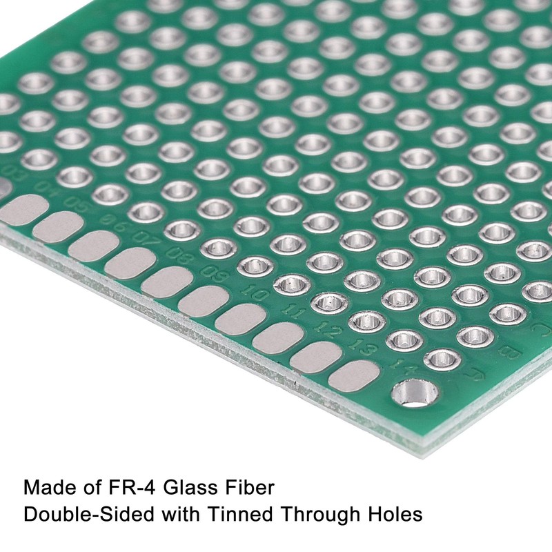- Made of FR-4 glass fiber, double sided with tinned through holes. The boards are durable and the tinned holes can take heat without lifting off. The green layer on the surface of the board is used to protect the formed circuit diagram.