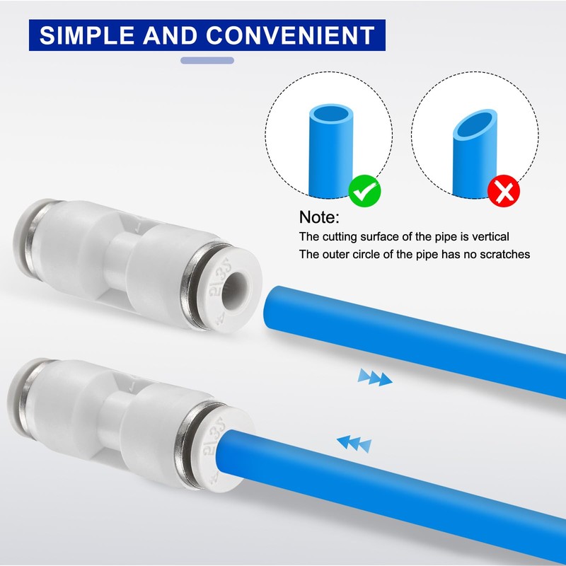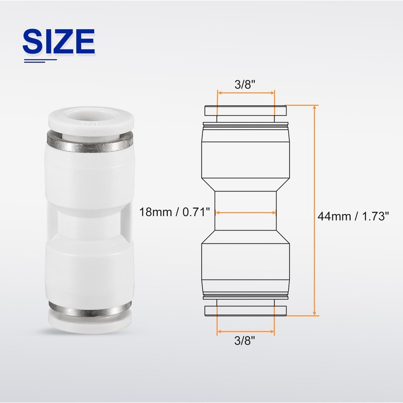- Size - Small Tube OD: 3/8"; Large Tube OD: 3/8"; Tube Dia: 18mm / 0.71"; Overall Length: 44mm / 1.73"; Body Type: Straight Male; Package Included: 1 x Push-in Connect Fittings. Push-in Connect Fittings are suitable for a variety of pipe materials, including PU / PA / PE / PVC pipes.