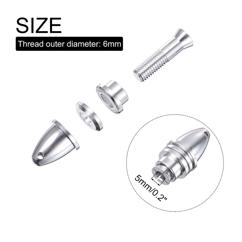 - The RC Airplane Propeller Adapter, Size: 5mm(Aperture); Color: Silver; Material: Aluminum; In the Package: 2 Pack RC Airplane Spinner;(The product is equipped with a 5mm shaft, a 6mm thread outer diameter, and is suitable for a 6mm hole blade.)