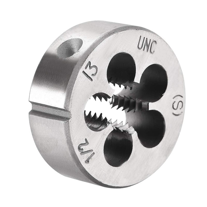 - Round die: thread size: 1/2"-13 UNC; outer diameter (AD): 38 mm/1.5 "; thickness: 14 mm/0.55 "; accuracy class: 6g. Made of alloy tool steel, hardness and wear resistance.