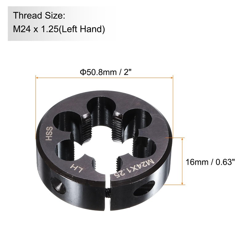 - Size - Metric Thread Size: M24 x 1.25; Outer Diameter: 50.8mm / 2"; Thickness: 16mm / 0.63"; Cutting Direction: Left Hand; Style: Adjustable Die. The round die can process, correct, or clean external threads.