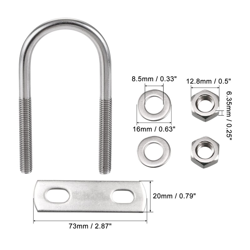 • Round Washers Size: 16 x 8.5 x 1mm / 0.63" x 0.33" x 0.04"(OD*ID*T); Package Content: 1 x U-Bolt, 2 x Nuts, 2 x Round Washers, 1 x Plate