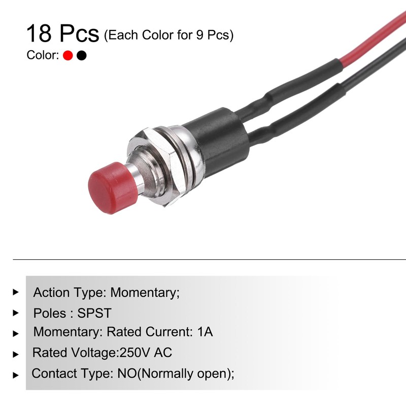 sourcing map Set of 18 1A 250V AC 7mm Mini Momentary Push Button Switch SPST PBS-110 NO Black/Red Switch Button with Pre-Soldered Wires for Electronic Devices Household Appliances