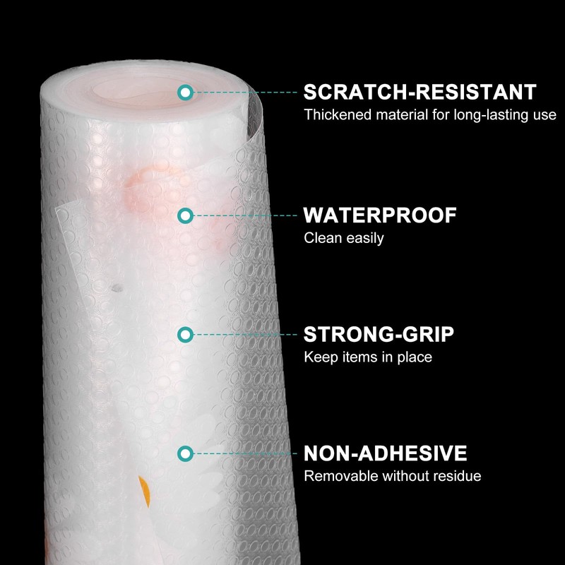 - Multifunctional - The shelf drawer liner is engineered with a non-adhesive design, it won’t be sticky to the furniture and it has strong grip, helps keep your items in place, and prevents fragile items from slipping. Meanwhile, the cabinet liner can not only be used as a kitchen liner to ensure the clean of the home.