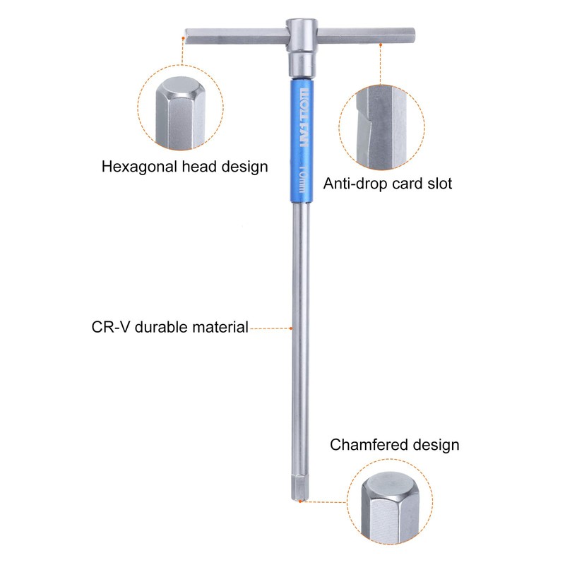 • Material - T-handle wrench is quenched and heat-treated chrome vanadium alloy steel (48-52 HRC), surface chrome plating, high strength and hardness, rust-proof and wear-resistant.