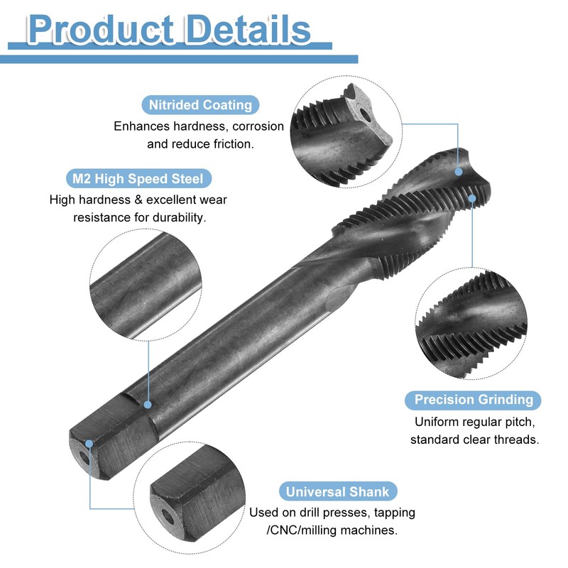 Descriptions:The spiral flute design prevents breakage, and enables more efficient tapping. The spiral tip of the tap helps guide it into the hole, reducing the torque required to turn it, and the flutes easily remove extra from the hole and machine.