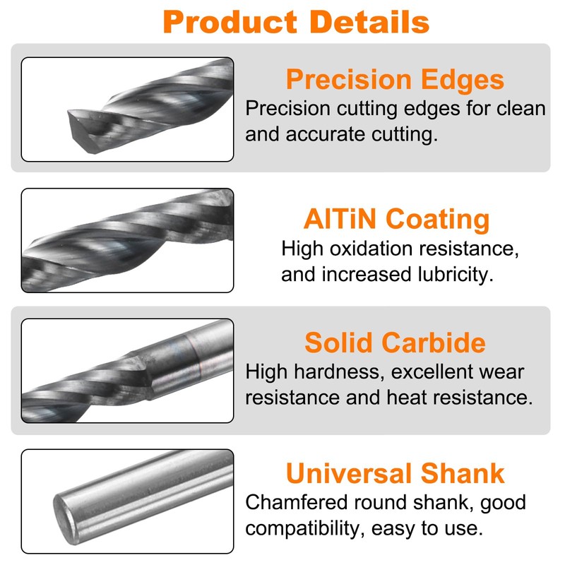 - Material - Solid carbide milling bit offers high hardness, excellent wear resistance, excellent heat resistance, durability, and good cutting performance. AlTiN (Aluminum Titanium Nitride) coating provides enhanced hardness, high oxidation resistance, and increased lubricity. Offers excellent performance in dry cutting applications and at high temperatures.