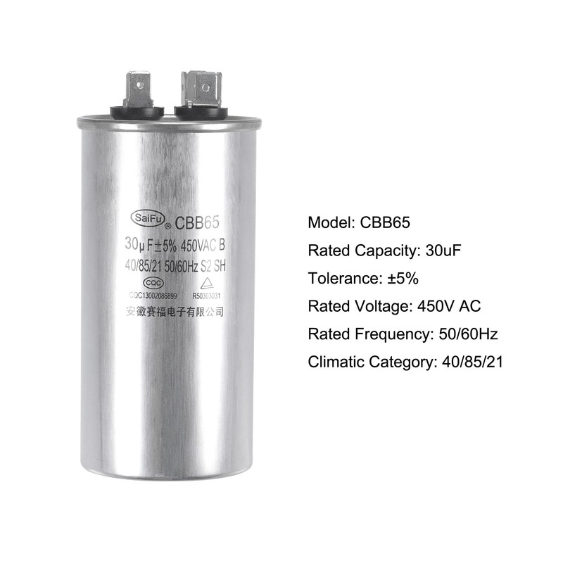 - [Specification] - Rated capacity: 30uF; Tolerance: ±5%; Rated voltage: 450V AC; Body size: 114 x 50 mm / 4.5 x 2 inches (L x D); Rated frequency: 50/60Hz; Climate class: 40/85/21
