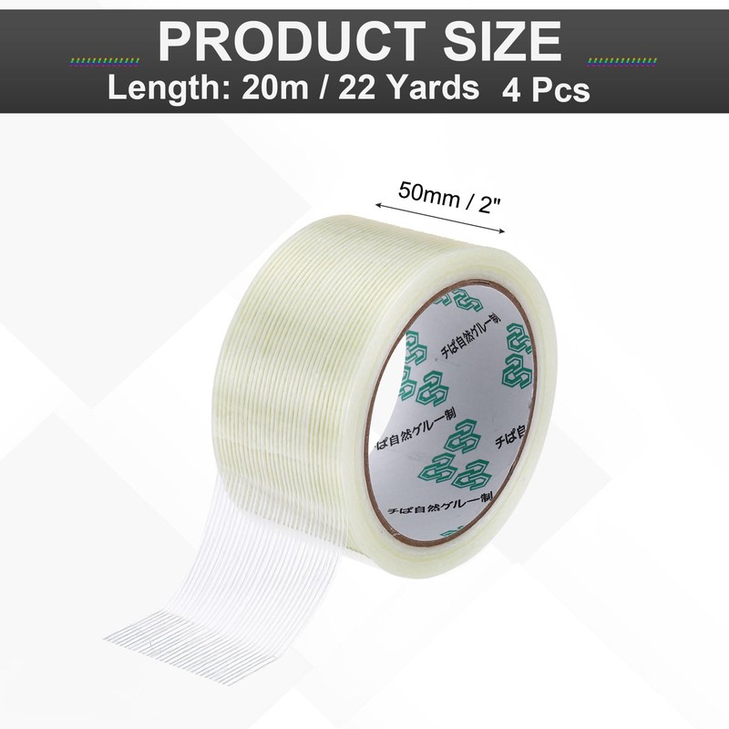 - Thickness: 5.9 Mil;Width: 50mm / 2 Inch;Length: 20m / 22 Yards ;Color: Transparent;Material: Fiberglass;In The Package of: 4 Roll x Reinforced Packing Tape