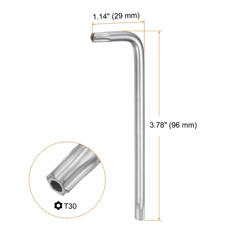- Size - T30 Torx chamfered tip, 3.78" (96 mm) long arm, 1.14" (29 mm) short arm.