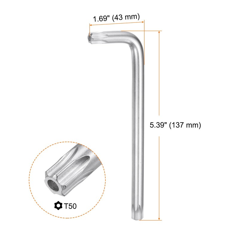 - Size - T50 Torx chamfered tip, 5.39" (137 mm) long arm, 1.69" (43 mm) short arm.