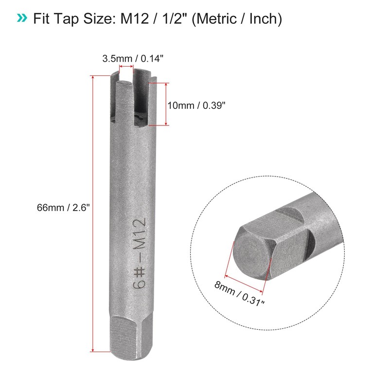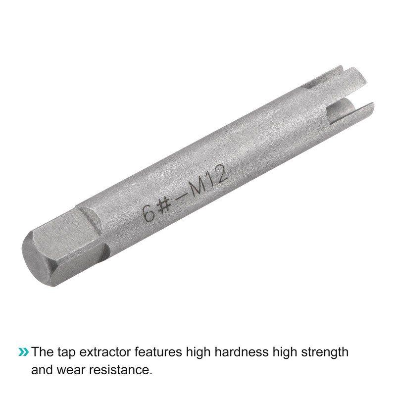 • Tap Extractor: Model: 6#; Fit Tap Size: M12 / 1/2" (Metric / Inch). Made of high carbon steel, the tap extractor features high hardness high strength and wear resistance.