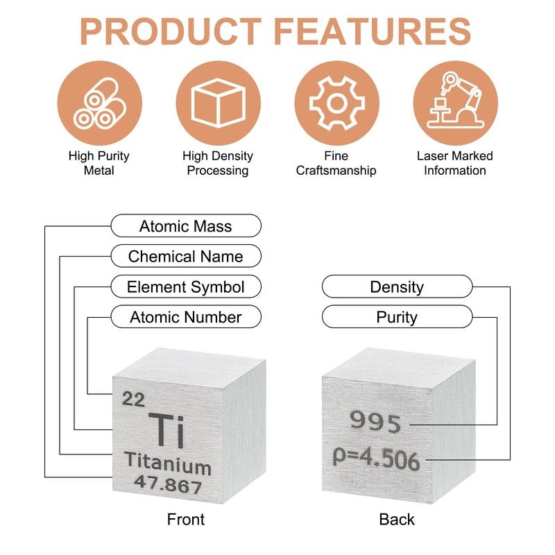 • [What You Get] - Package content comes with 1 piece of 0.5 Inch high-density Titanium Cube. The following important details: Chemical Name(Material): Titanium; Element Symbol: Ti; Atomic Number: 22; Size: 12.7 x 12.7 x 12.7mm/0.5 x 0.5 x 0.5inch(L*W*H).