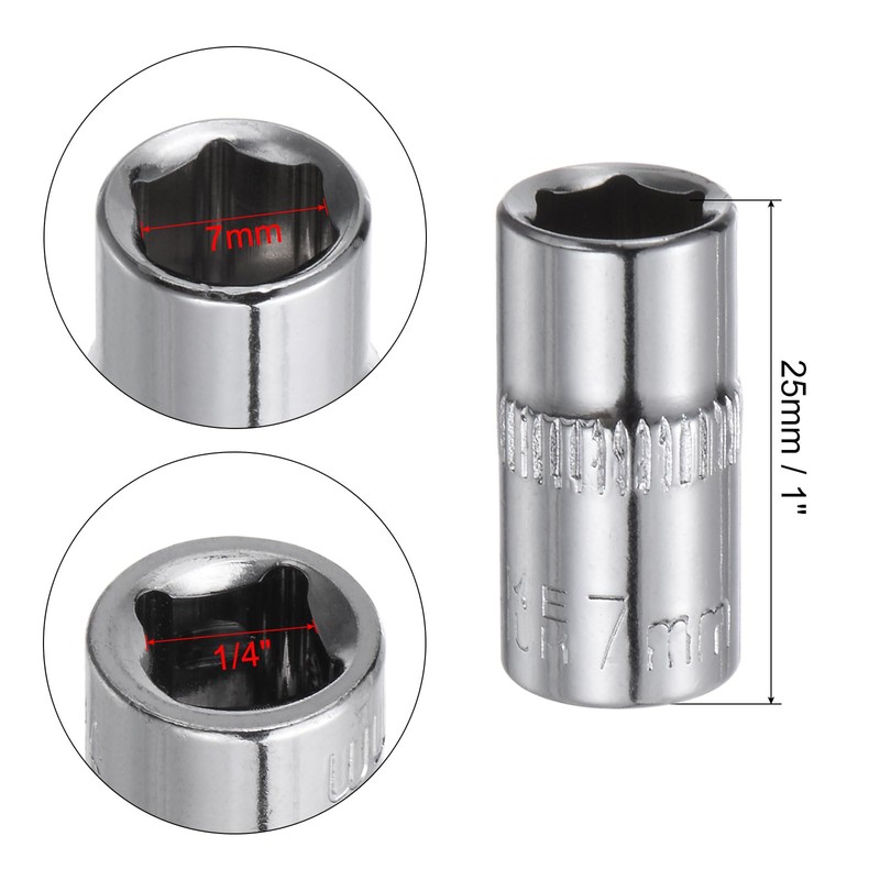 - [Size] - 1/4-inch drive, 7mm 6-point socket, 28mm (1-inch) total long.