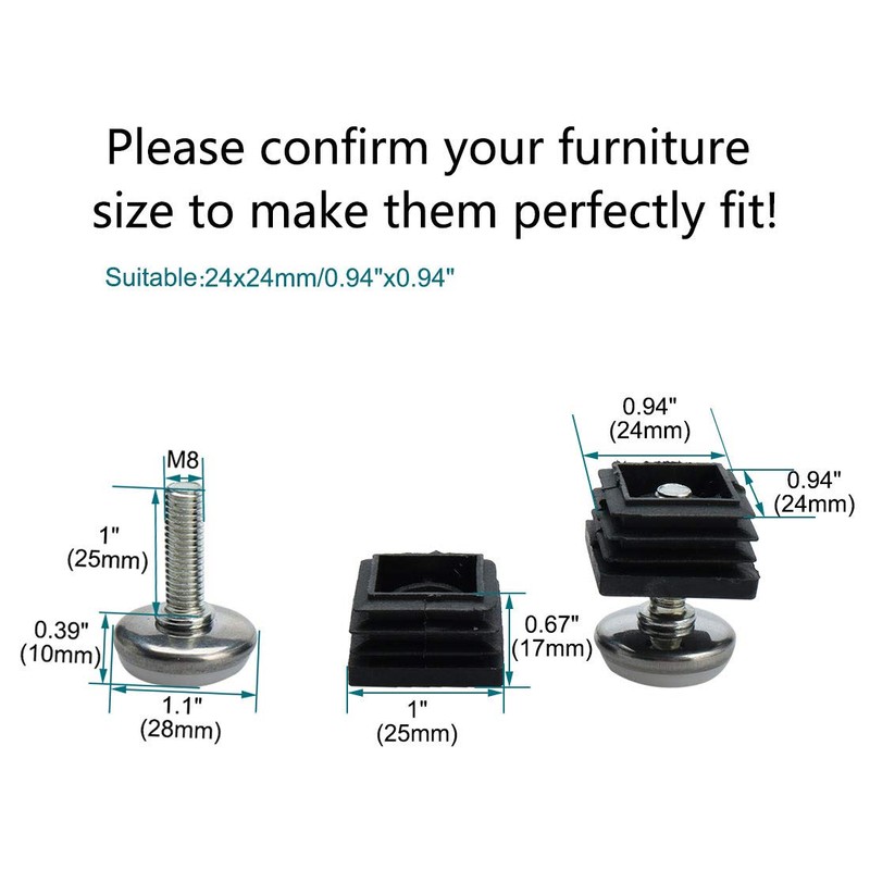 - SIZE - Fit for Mounting Size: 0.94"x0.94"(L*W); Total Size(Mini): 1.1" x 1.46"(D*H); Total Size(Max): 1.1" x 1.73"(D*H); Insert Total Size: 1" x 1" x 0.67"(L*W*H); Insert Thread Size: 0.94" x 0.94"(L*W); Leveling Foot Total Size: 1.1" x 1.46"(D*H); Leveling Foot Base Size: 1.1" x 0.39"(D*H); Leveling Foot Thread Size: M8 x 1"(D*L); Leveling Foot Size: M8x1"x1.1"; Adjustable Range of Height: 0.47"-1.06"; Package Include: 10 Pcs