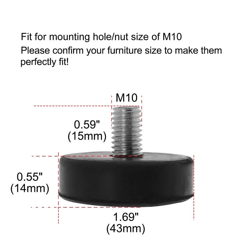 - SIZE - M10 x 15 x 43mm/M10 x 0.59" x 1.69"(Thread Dia.*Thread Length*Base Dia.); Thread Pitch: 1.5mm; Thread Size: M10 x 15mm/M10 x 0.59"(D*L); Base Size: 43 x 14mm/1.69" x 0.55"(D*H); Package Include: 12 x adjustable leveling feet