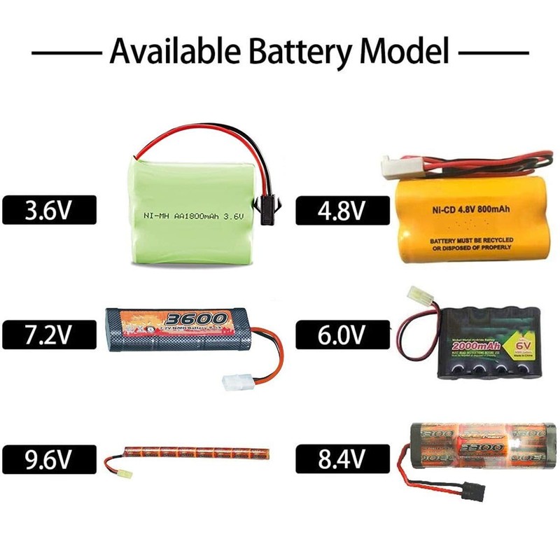 - AUTO STOP SMART BATTERY CHARGER- Charges the NiMH battery pack and nicd battery pack of 3-8 cells(3.6V,4.8V,6.0V,7.2V,8.4V,9.6V) with traxxas plug. The battery is automatically powered off when fully charged;