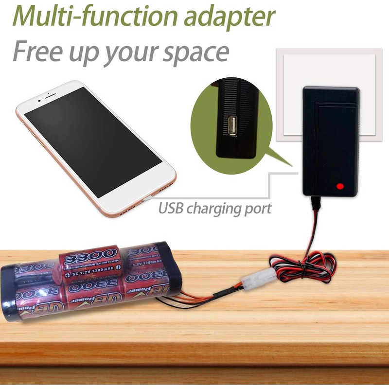 - RC Battery Charger with USB Socket- Space-friendly design, the adapter has a 5V/ 2000mA USB interface, you can use it to connect to other devices, such as your mobile phone, while using the charger, without taking up charging space;