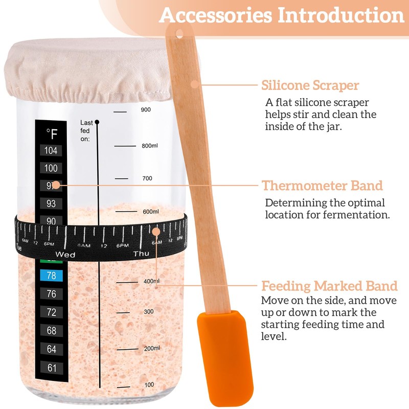 • Monitor Temperature and Feeding: The kit comes with an instant-read thermometer that allows you to monitor the temperature of your starter and ensure that it's in the optimal range for fermentation activity. The feeding day tracker band helps gauge starter rise in the jar, making it easier for you to keep track of your sourdough starter's progress.