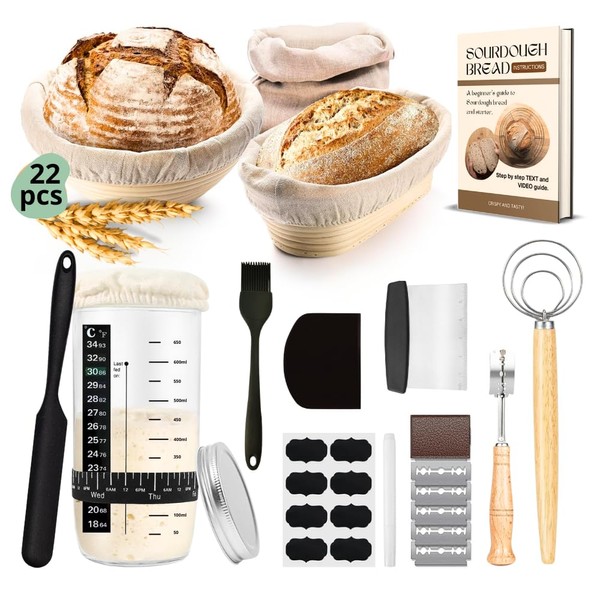 - ✅ THE ONLY SET YOU'LL EVER NEED - This 22 pcs premium bundle comes with everything you need to start making delicious golden baked bread. Included accessories are: 2x bread proofing basket (round & oval) with 2x cloth cover to protect the basket, 1x sourdough starter jar with cloth cover, 1x danish dough whisker (to stir wet dough 3x faster than a traditional spatula) 1x feeding band, 1x thermometer, 8x sticker, 1x chalk pen, 1x jar spatula ( to get the dough out of the jar easier), 1x pastry brush, 1x plastic scraper, 1x stainless steel scraper, 1x bread lame with 5x stainless steel blades (to assist with dough expansion).