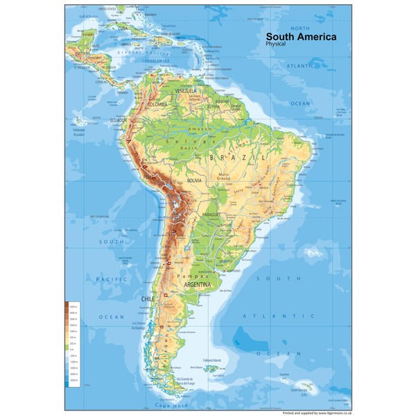 South America Physical Map - 23.3 x 16.5 Inches - Paper Laminated