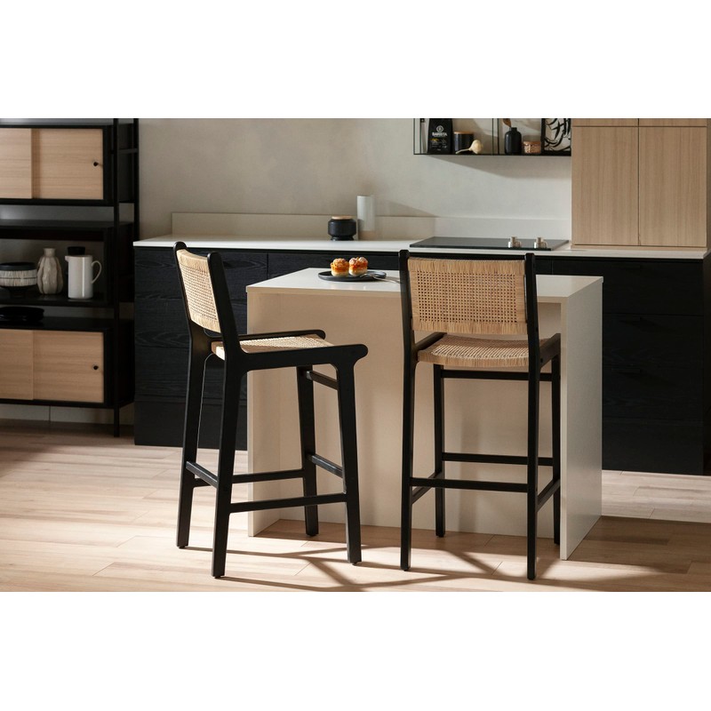 - BOHO-CHIC BAR CHAIR: This charming stool will look stunning next to your kitchen island. The teak wood and natural rattan combo gives it an exotic look that’ll create a harmonious atmosphere in the heart of your home.