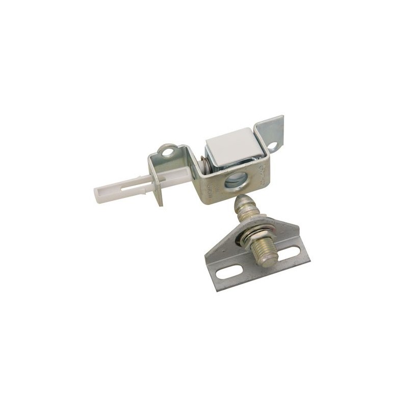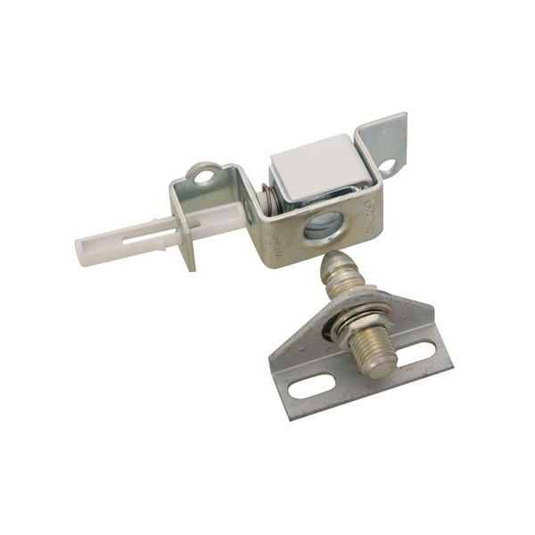 For near edge applications. Provides clean, unblemished panel surfaces. Push the panel to latch. Floating keeper option includes U-bent washer to assist alignment of hinged panels. Stud of floating keeper will float .16" total movement. Steel latch with stainless steel spring with white thermoplastic actuator button.