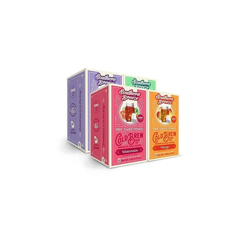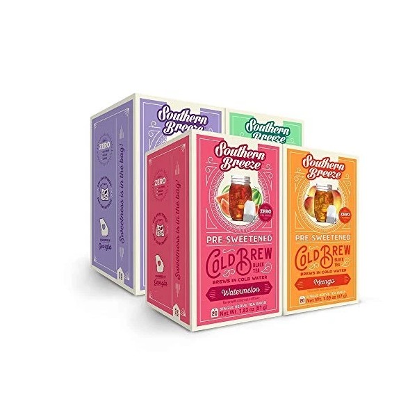 - SINGLE SERVE COLD BREW TEA BAGS: Southern Breeze black tea promises a bold taste without the hassle of boiling water. Each cold brew tea box contains sweet tea with 20 individually wrapped tea bags per box, pack of 4 with different flavors of Blackberry, Mango, Mint and Watermelon