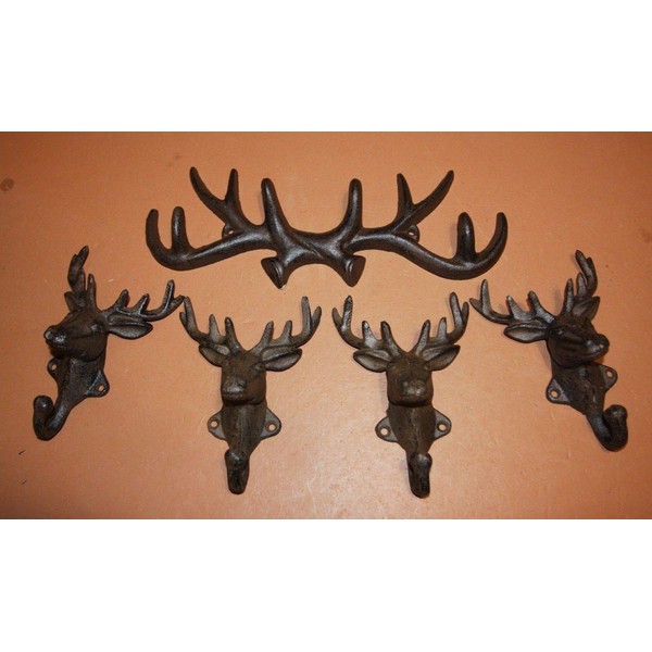 Southern Metal Wall Mounted Deer Head Antler Coat Hat Rack Wall Hooks, Solid Cast Iron Bundle of 5
